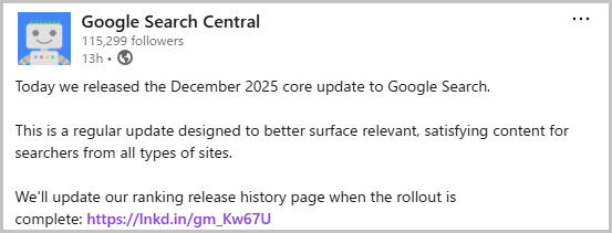 日本時間12月12日、GoogleはXやLinkedInを通じて、2025年12月のコアアップデートを開始したことを発表しました。