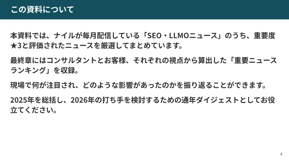 毎月配信してきた「SEO・LLMOニュース」から★3評価の重要トピックだけを厳選。 2026年の打ち手を考えるための、年間ダイジェスト資料です。